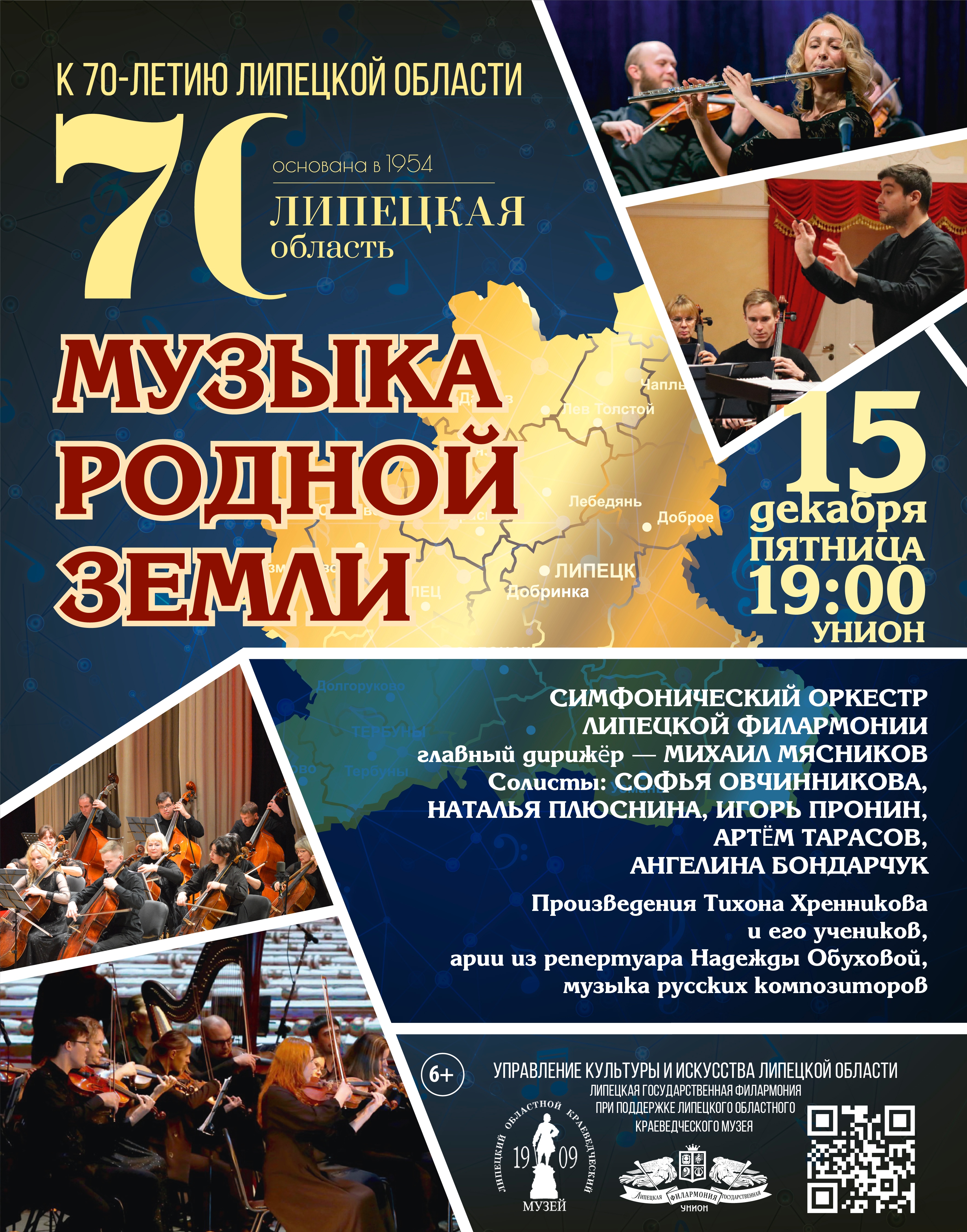 15 декабря в к/з «Унион» состоится мультимедийный проект к 70-летию Липецкой области при поддержке Липецкого областного краеведческого музея, в котором участвуют Симфонический оркестр Липецкой филармонии, студентка Академического музыкального училища при Московской консерватории скрипачка Ангелина Бондарчук и солисты филармонии Артем Тарасов, Наталья Плюснина, Игорь Пронин, Софья Овчинникова.